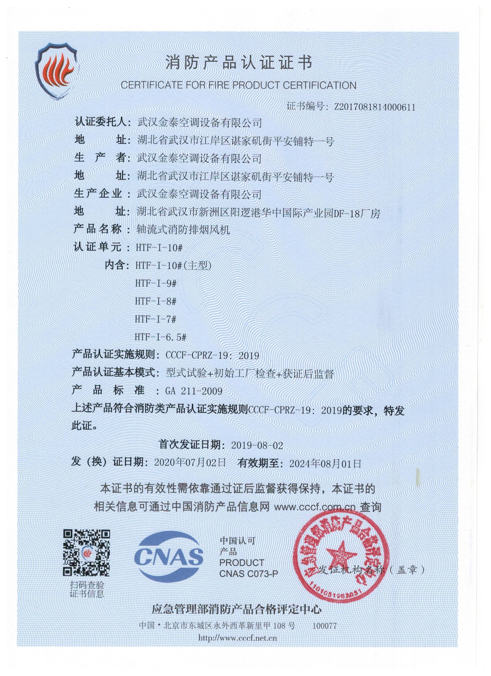 武漢金泰空調設備有限公司 是國內長期專注于民用風機、工業風機領域的標桿企業:專業生產消防排煙風機系列、排煙防火閥系列、一般通風機系列(軸流式、離心式、屋頂式、壁式、隧道式、射流式)、風口、風管等消防及通風設備。產品經公安部消防產品合格評定中心評定符合消防產品CCC標準;經中國合格評定國家認可委員會認證的檢驗所檢驗合格;經國家防火建材質量監督檢驗中心(四川中心)火燒實驗,耐火性能達標。